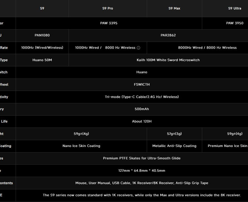 Receivers: 1K included with all S9 models; 8K included with S9 Ultra only